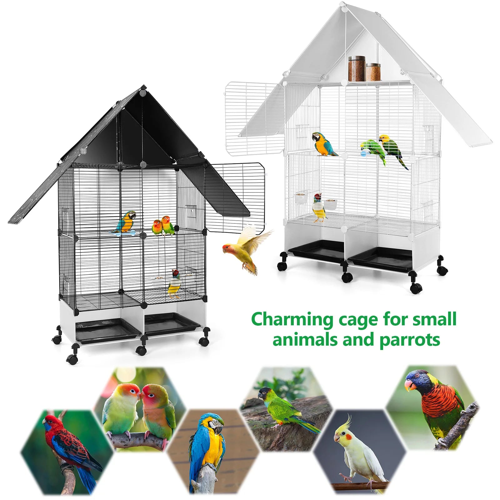 - Versatile, all-in-one habitat: suitable for lovebirds, parakeets, cockatiels, conures, and even African Grey, as well as sugar gliders or small rodents; available in Black or White; includes stand, standing rod, water bowl, food box, and tray.