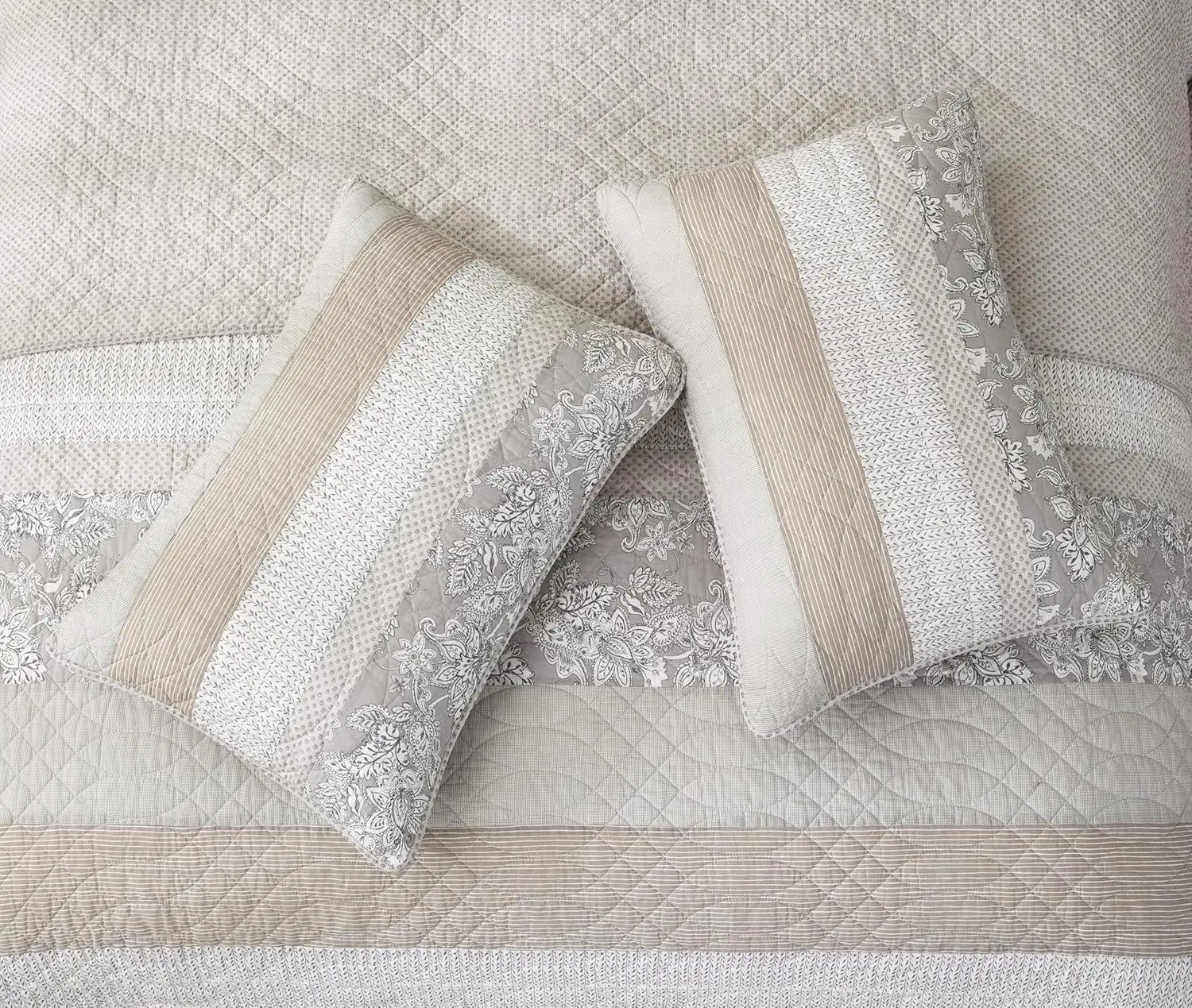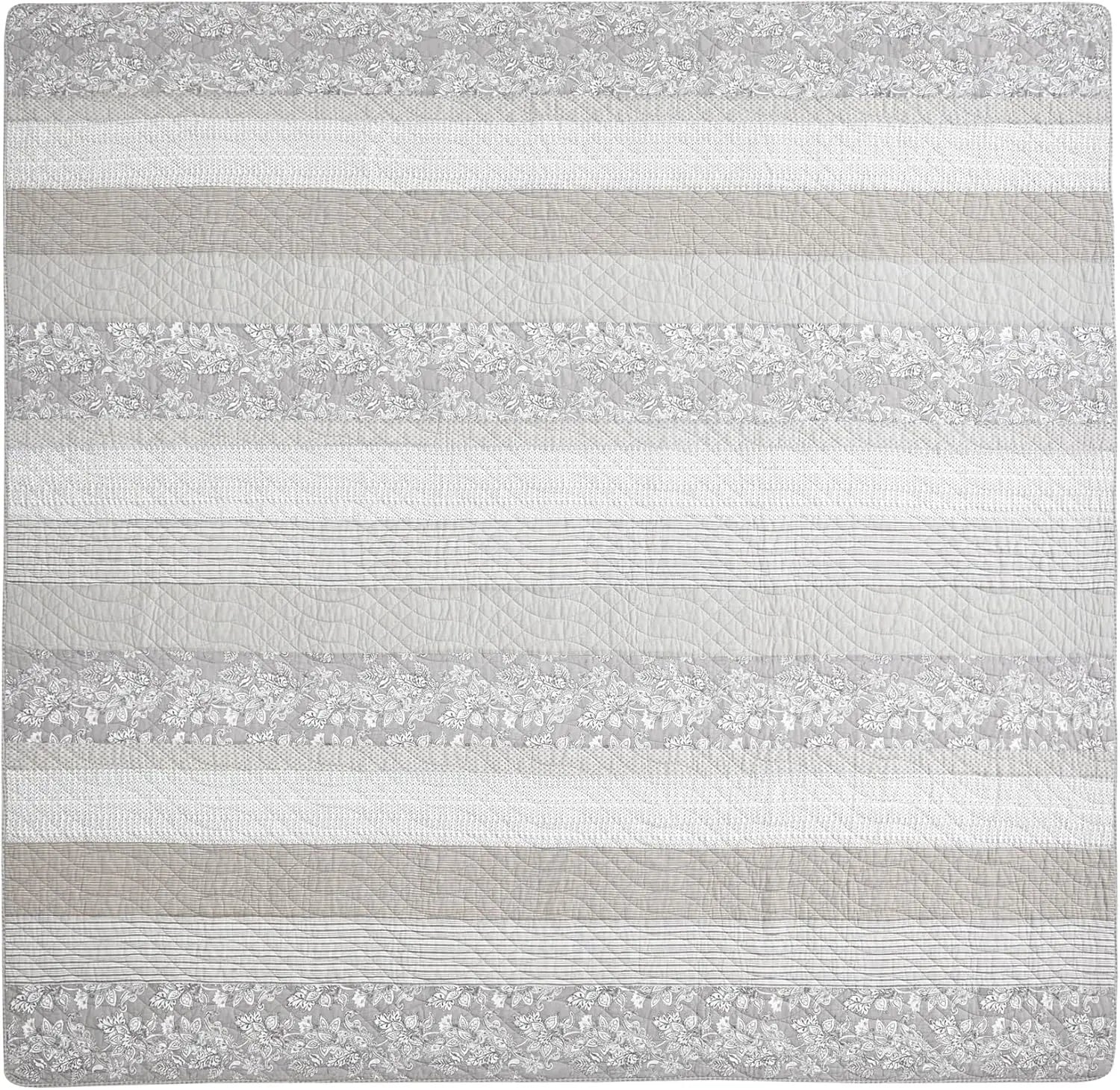 - Design and reversibility: You’ll appreciate the neutral patchwork of taupe, gray, and white with hibiscus florals and stripes, reversible to reveal a floral underside for two distinct looks.