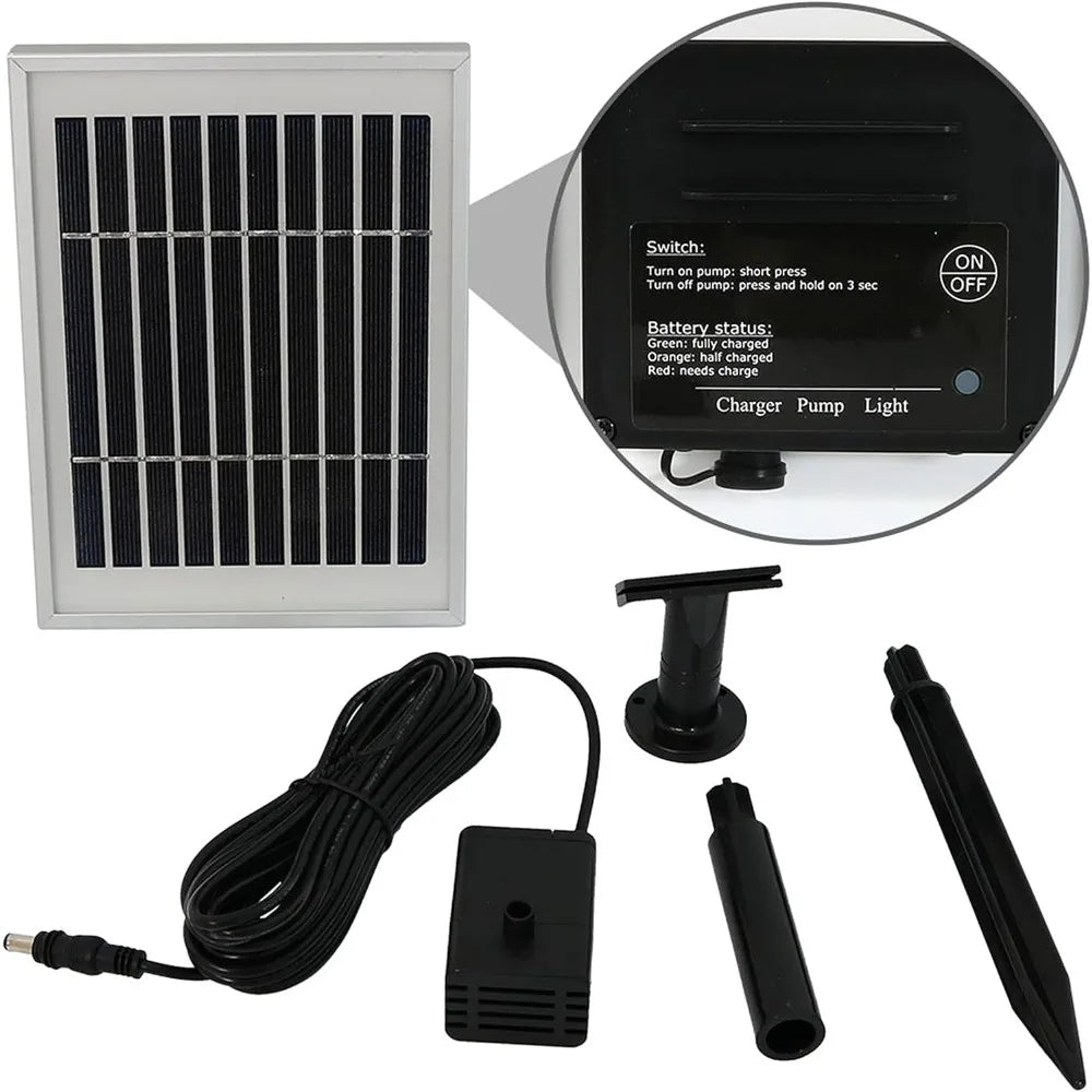 - Power options: run directly from the solar panel in bright sun, or switch on the battery backup to keep the water flowing when panels dim.