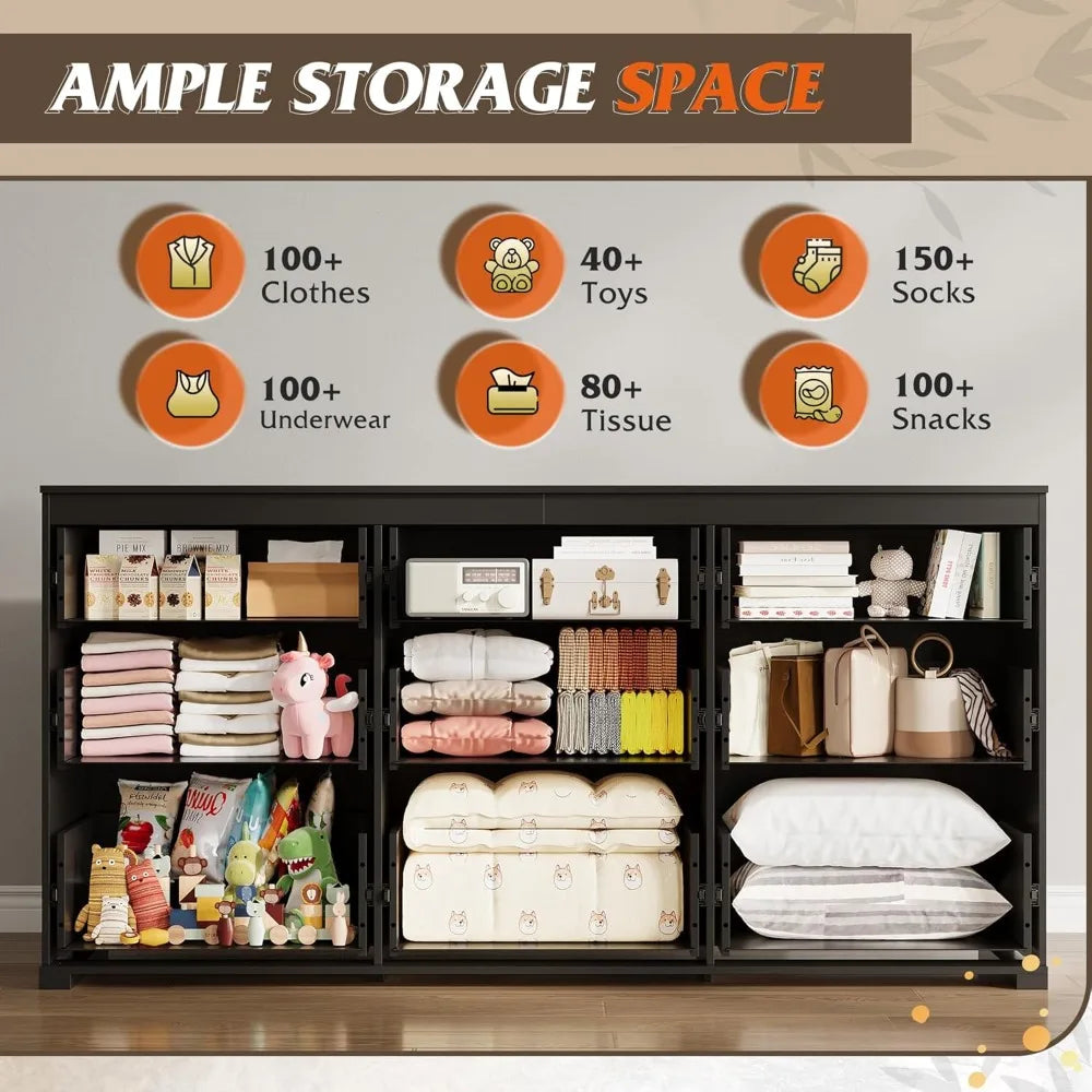 - You get 9 drawers (6 medium, 3 large) across 62.99" W x 31.57" H x 11.73" D, with a top surface that supports up to 175 lbs and accommodates a TV up to 75".