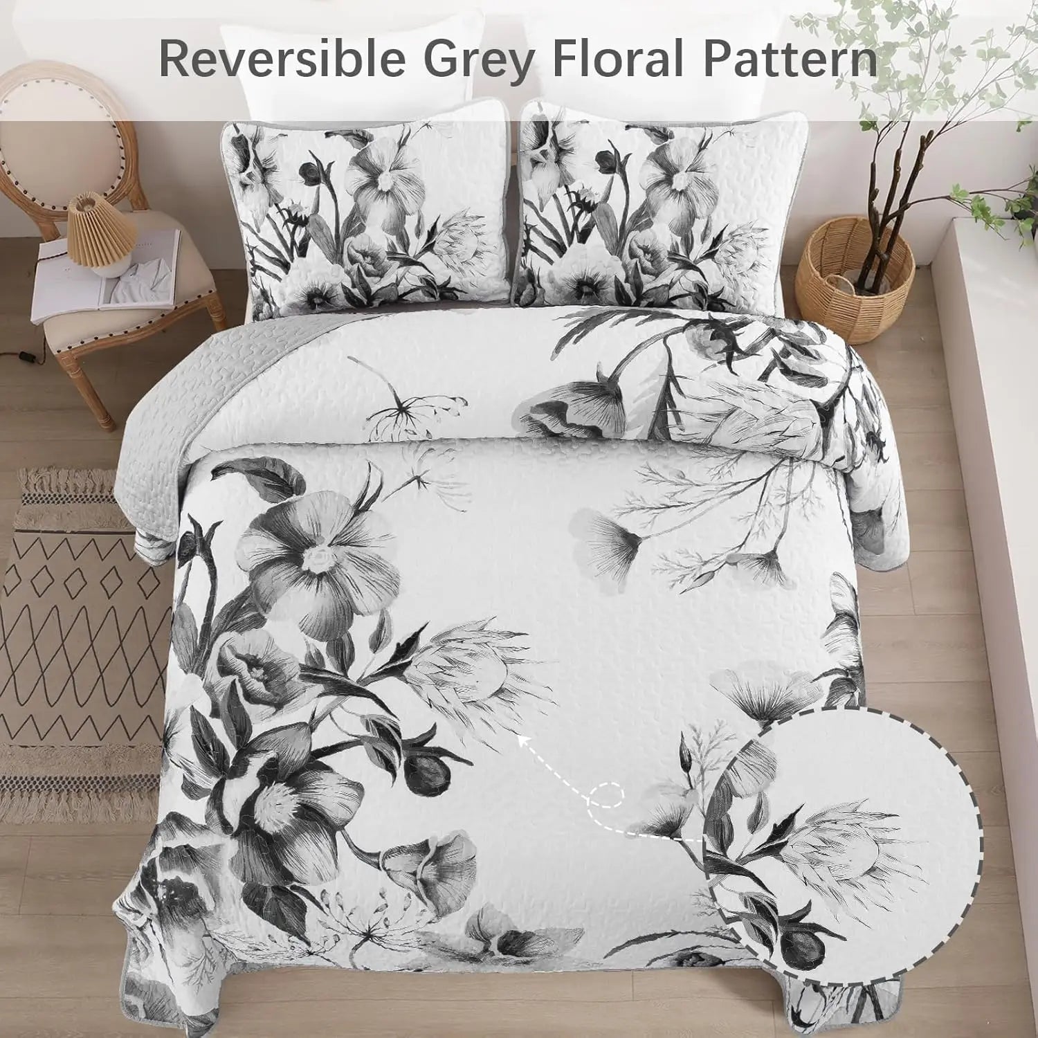 Experience the Floral Quilt Set 3 Piece Microfiber Bedspread All Seasons in your bedroom, where soft, breathable comfort meets modern grey floral style.