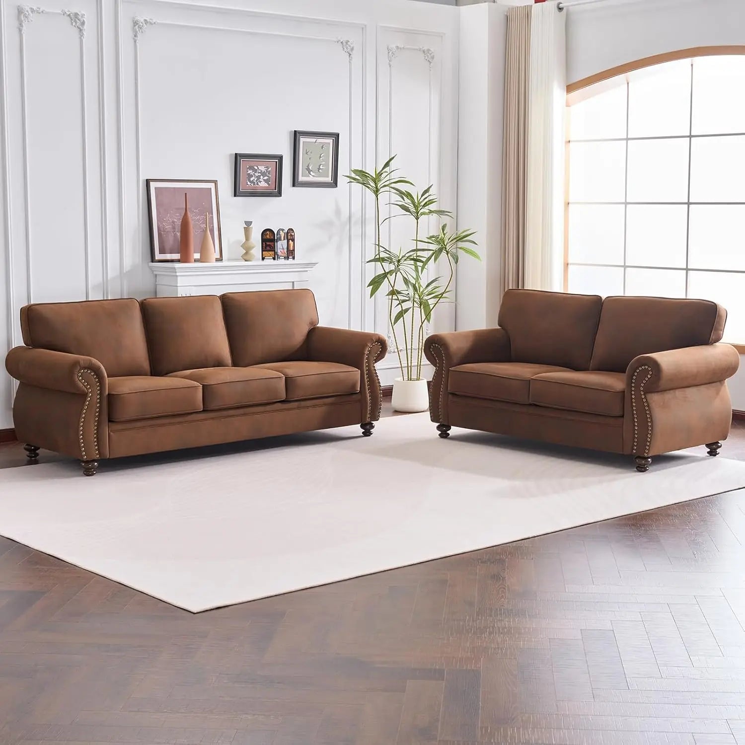 Turn your living room into a timeless focal point with a Mid-Century Sofa Set featuring rivet detailing, warm brown faux leather, and clean, modern lines.
