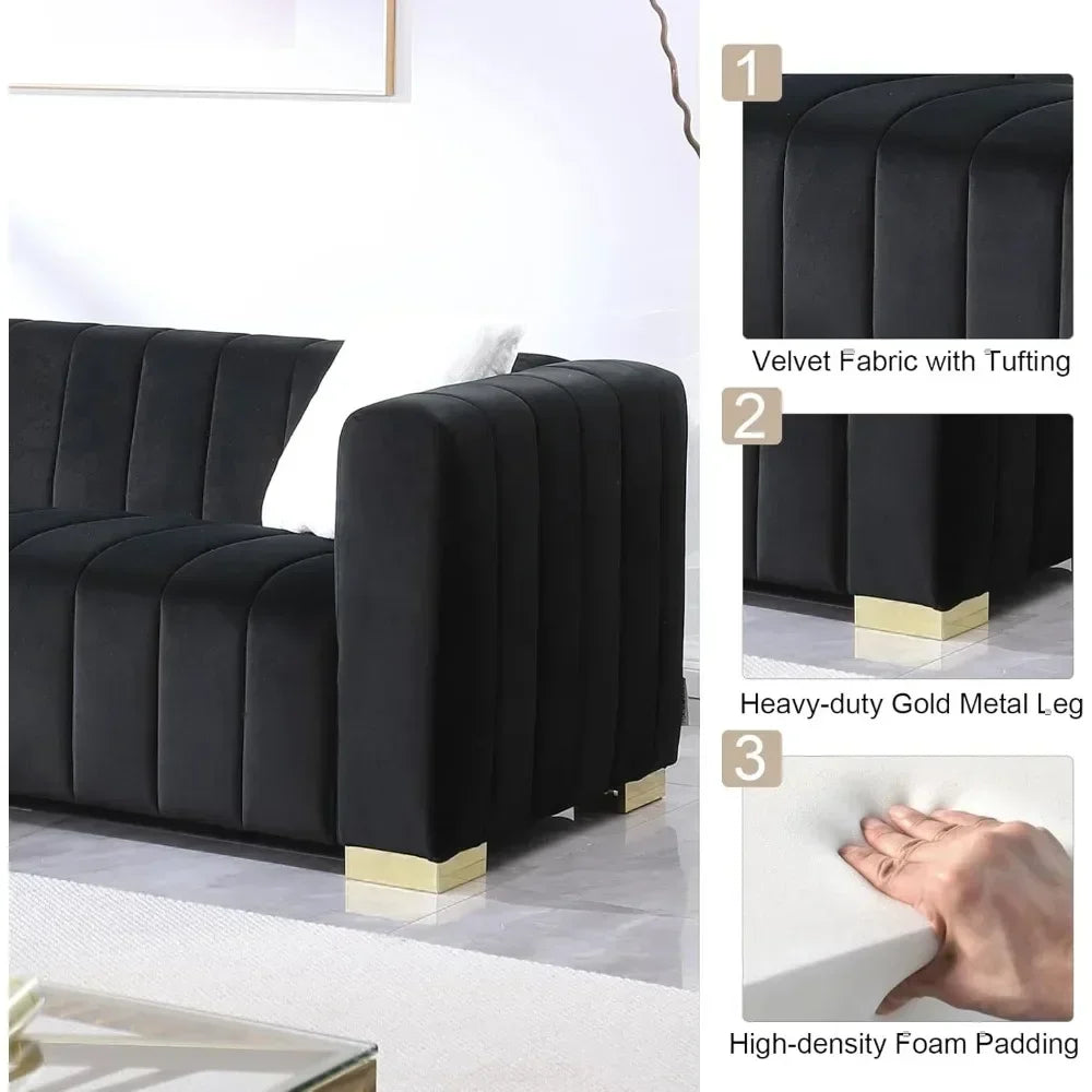 - Lux velvet fabric, channel tufting, square arms, and gold-tone metal legs create a sophisticated, high-end aesthetic you can see and feel.