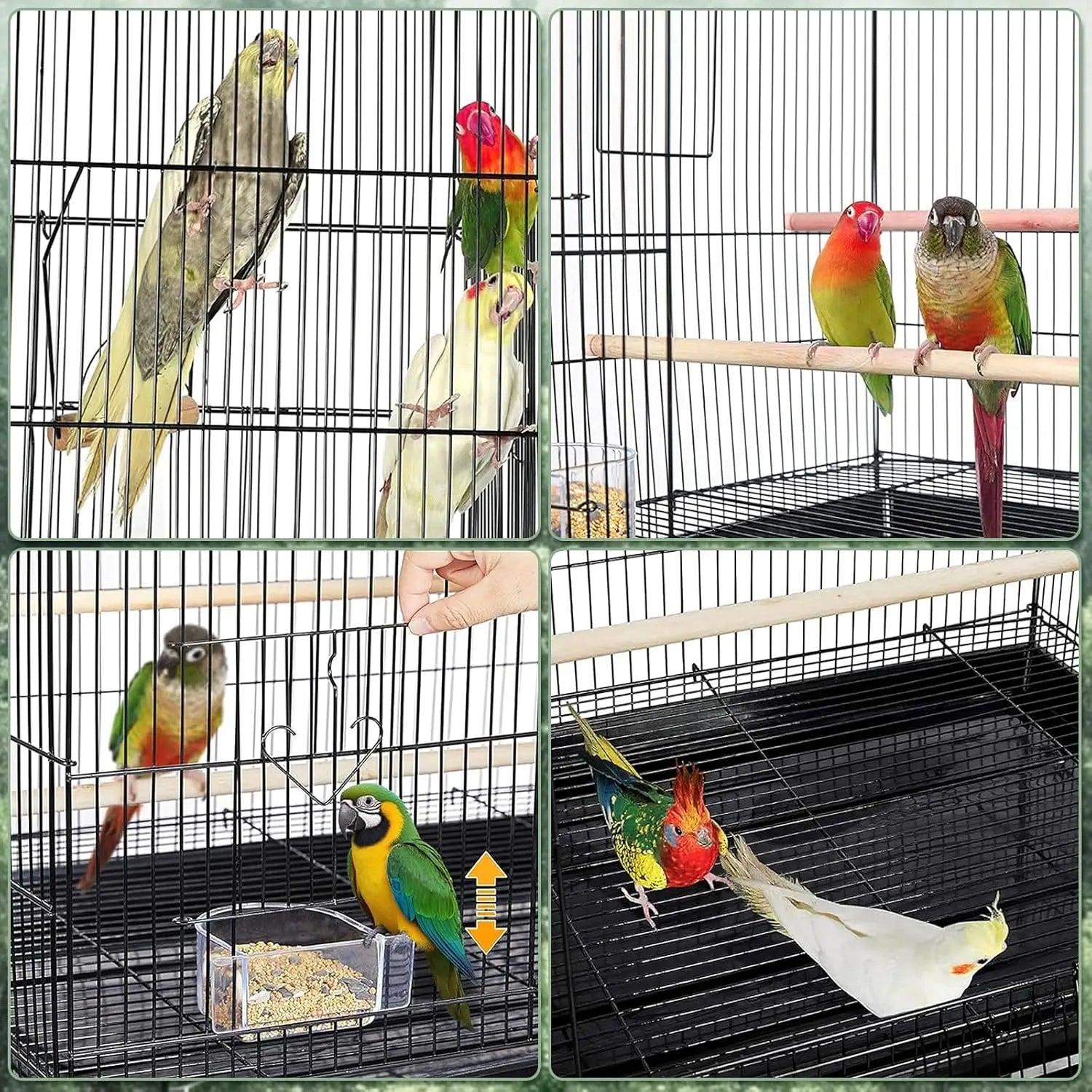 - Generous interior space for budgies, cockatiels, and small parrots to fly and stretch, with 2 natural wood perches for comfortable resting.