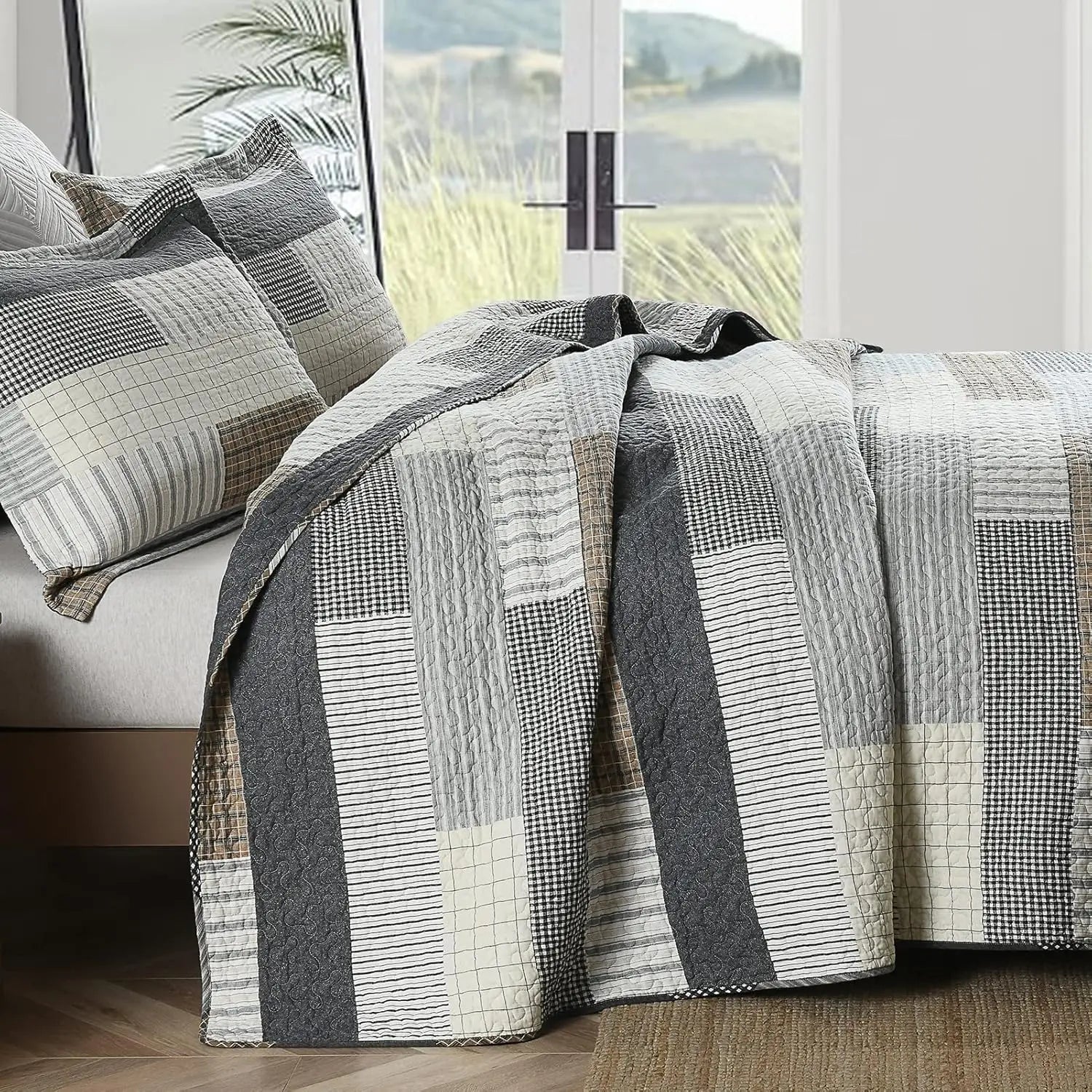 Cotton Patchwork Quilt Set With Reversible Plaid Design