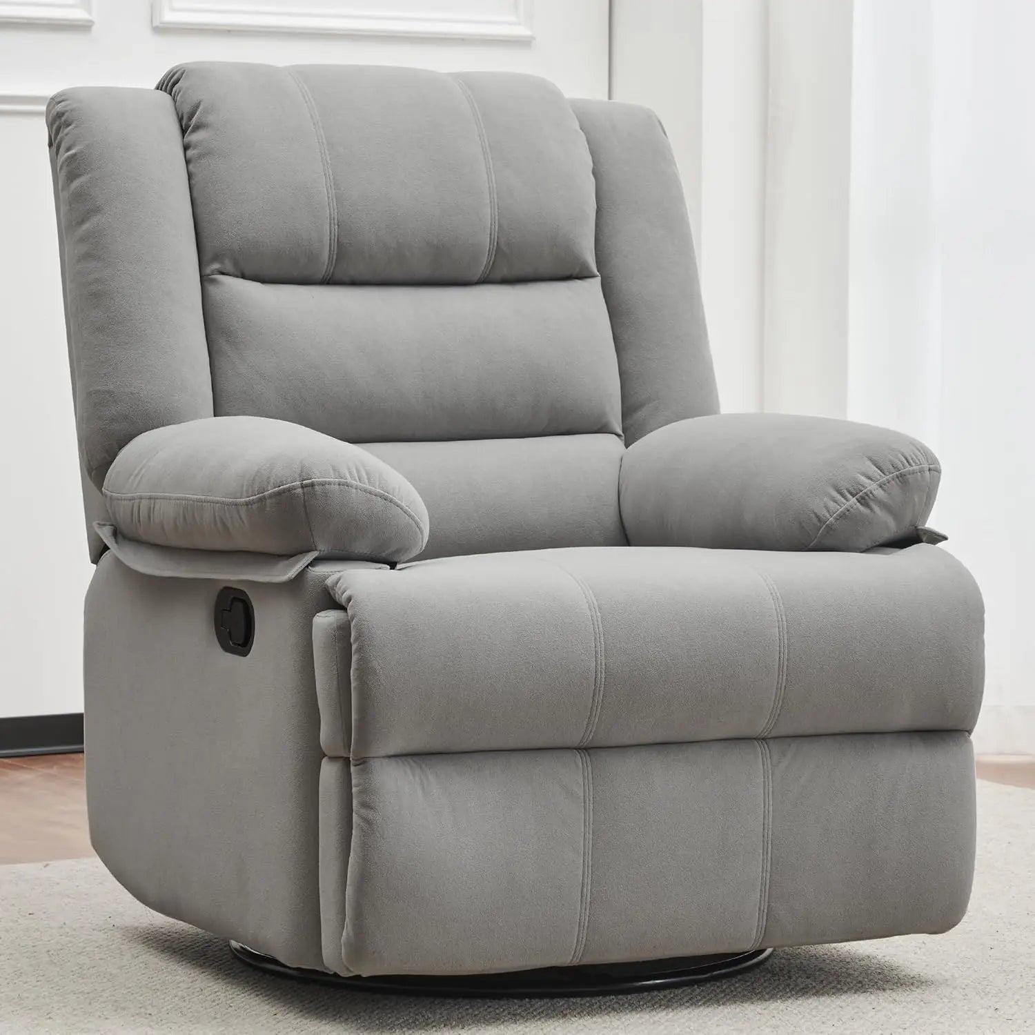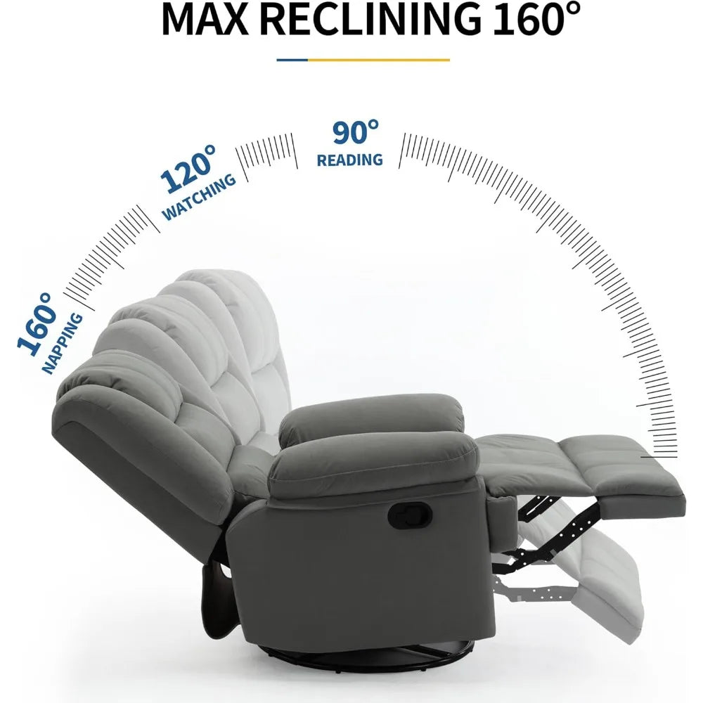 Experience effortless control and cloud-soft comfort with the Swivel Overstuffed Manual Glider Rocker Recliner Chair.
